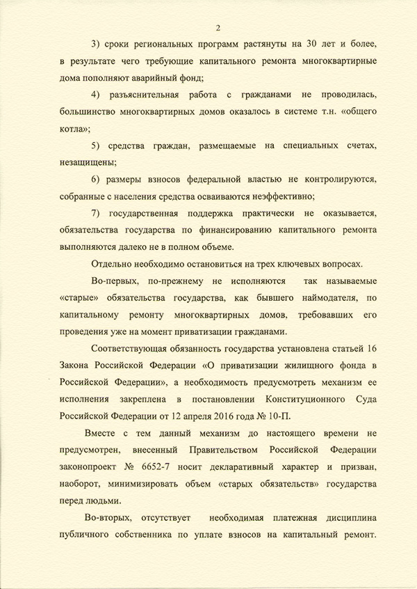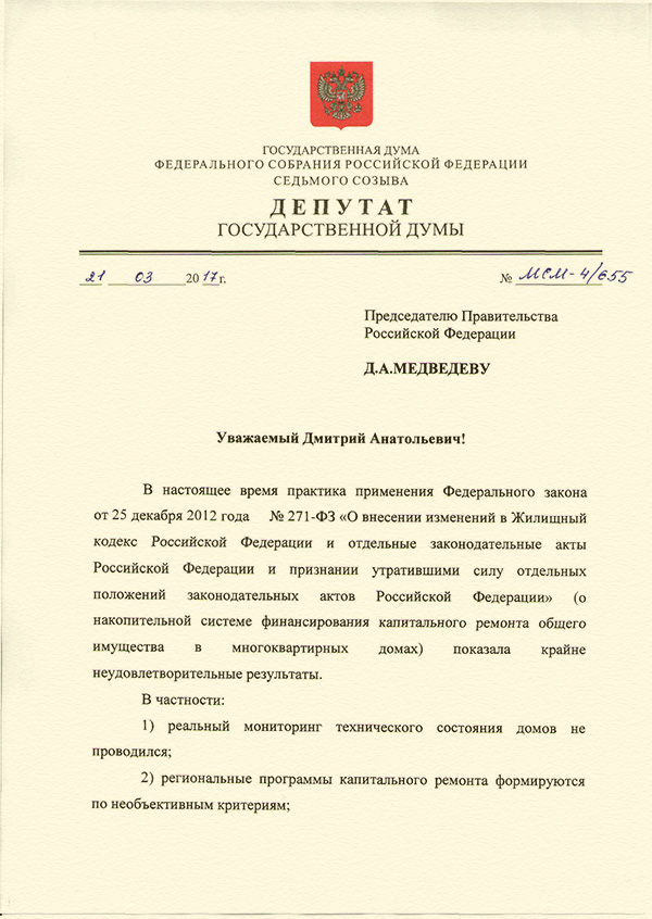 Руководитель фракции "СПРАВЕДЛИВАЯ РОССИЯ" в Госдуме Сергей Миронов совместно с руководителями фракций КПРФ и ЛДПР Геннадием Зюгановым и Владимиром Жириновским направил Председателю Правительства РФ Дмитрию Медведеву обращение по поводу неудовлетворительного состояния в сфере реализации системы капитального ремонта общего имущества в многоквартирных домах.