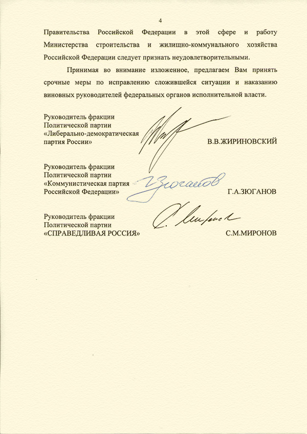 Руководители фракций ГД предлагают Дмитрию Медведеву принять срочные меры по исправлению сложившейся ситуации и наказанию виновных руководителей федеральных органов исполнительной власти.