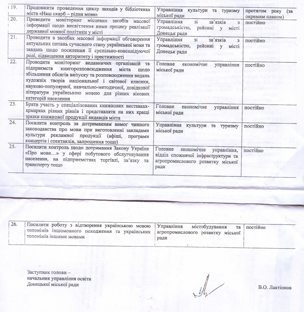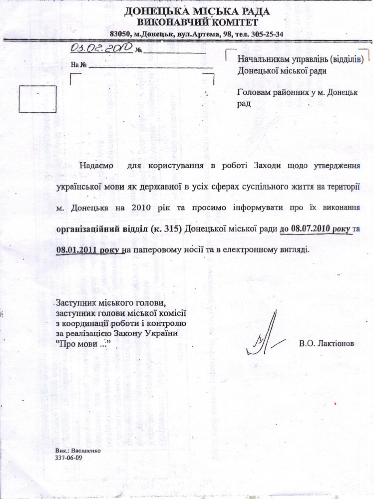 3 февраля 2010 г. заместитель городского головы - начальник управления образования Валентин Лактионов обязал начальников управлений (отделов) Донецкого городского совета и глав районных в Донецке советов информировать о его выполнении организационный отдел Донецкого городского совета.