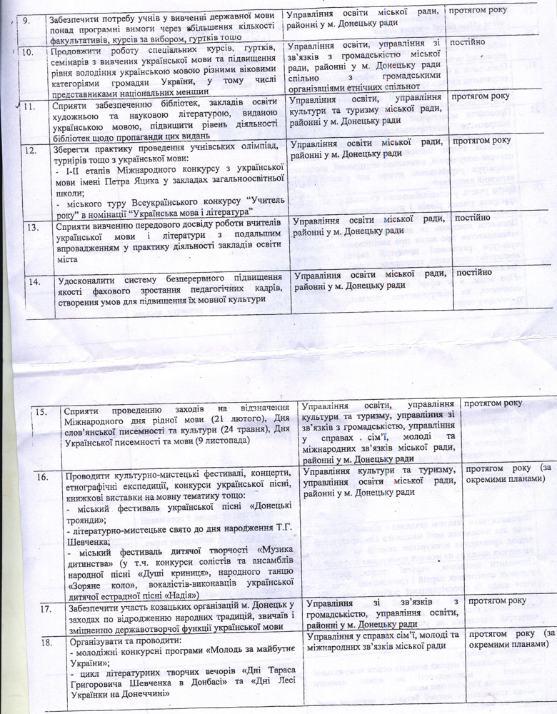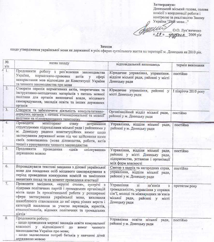 В распоряжении пресс-службы ПСПУ оказалась копия документа под названием "Меры по утверждению украинского языка как государственного во всех сферах общественной жизни на территории г. Донецка на 2010 год".