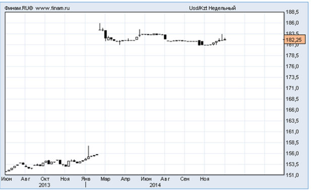 Центральный банк Казахстана, в отличие от ЦБ России, более грамотно выстроил свою курсовую политику. Еще в марте 2014 года, когда давление на золотовалютные резервы Казахстана увеличилось, ЦБ прекратил защищать курс тенге на уровне 156 тенге за доллар. Он перешел на "подготовленные оборонительные рубежи" на уровне 186 тенге за доллар.