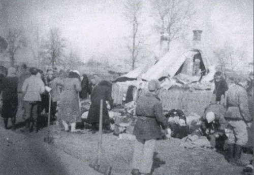 Фото 4 - ЛИПНИКИ (LIPNIKI), уезд Костопол, воеводство луцкое. 26 марта 1943. Некоторые поляки, уцелевшие от резни ОУН - УПА (OUN - UPA), совершают осмотр сожжённых польских дворов и идентифицируют убитых поляков. На переднем плане сожжённый польский Народный Дом, а на его фоне у забора стоит Йержи Скулски.