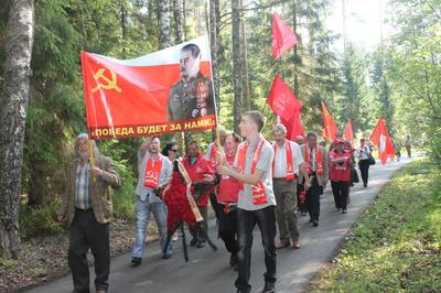 Псковские коммунисты возложили венок в виде пятиконечной звезды и живые цветы к монументу героям-комсомольцам в белорусской деревне Прошки. На пограничном мосту на территорию Латвии были переданы цветы для возложения к памятнику партизану Герою Советского Союза Иманту Судмалису. Венок в виде пятиконечной звезды и живые цветы легли к обелиску Героя Советского Союза, партизанки-разведчицы Марии Пынто. На латышской стороне собралась масса людей, которые скандировали лозунги советских времен, которые сейчас приобрели новое звучание и неимоверно актуальны: «Фашизм не пройдет!», «Воспрянет Советский Союз!».