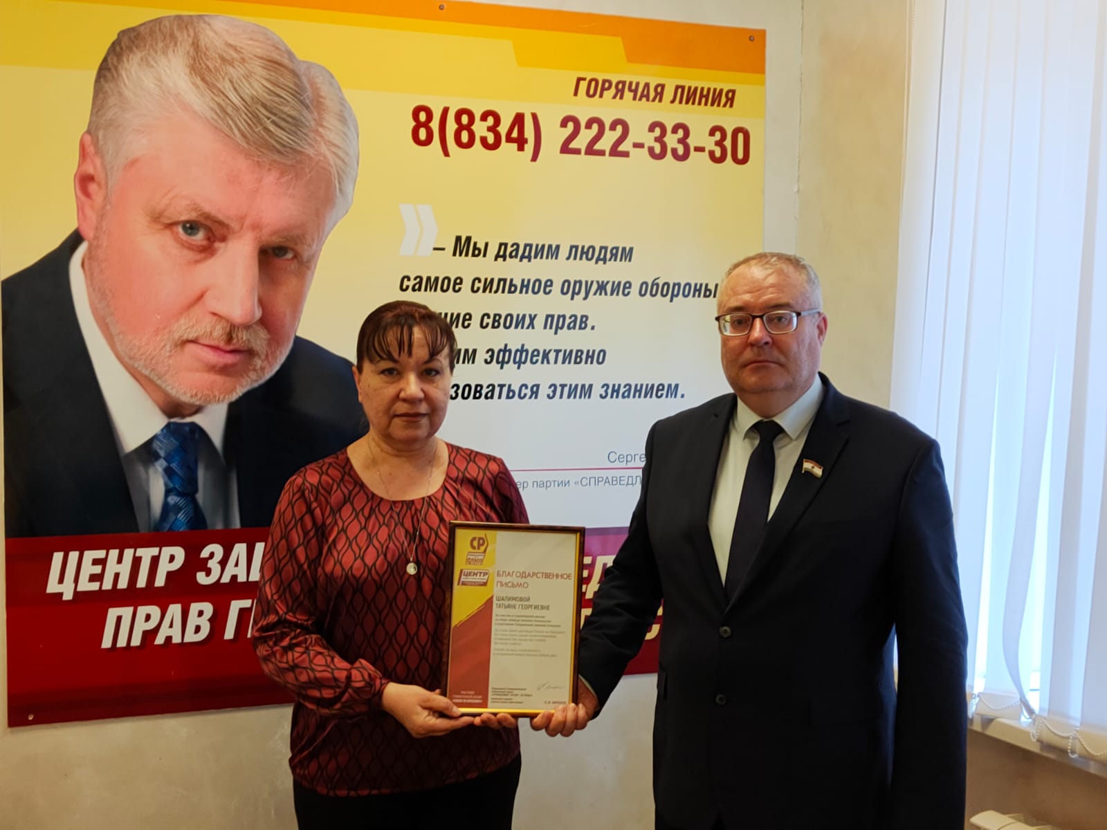 Руководитель фракции "СПРАВЕДЛИВАЯ РОССИЯ – ЗА ПРАВДУ" в Государственном Собрании Республики Мордовия, Председатель Совета регионального отделения Партии СРЗП Тимур Гераськин в саранском Центре защиты прав граждан встретился с участниками проекта "Своих не бросаем". Он вручил активистам Благодарственные письма от Председателя СПРАВЕДЛИВОЙ РОССИИ – ЗА ПРАВДУ Сергея Миронова и выразил признательность за неоценимый вклад в общее доброе дело.