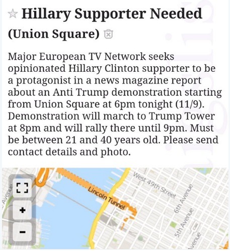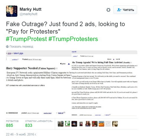 В интернете были обнаружены специальные вакансии и группы, где набирали протестующих за деньги. Клинтон пользуется такой «народной любовью», что ей приходится покупать поддержку. Любопытно, когда демонстранты начнут сооружать баррикады, и ставить палатки. Запасы печенья Виктории Нуланд ещё, наверняка, могут пригодиться.