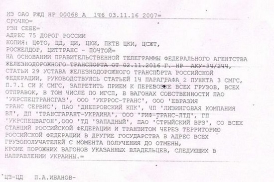 Российская железная дорога ввела запрет на перемещение по территории России железнодорожных цистерн украинских производителей, пишет в понедельник, 7 ноября, OilNews, ссылаясь на соответствующую телеграмму РЖД.
