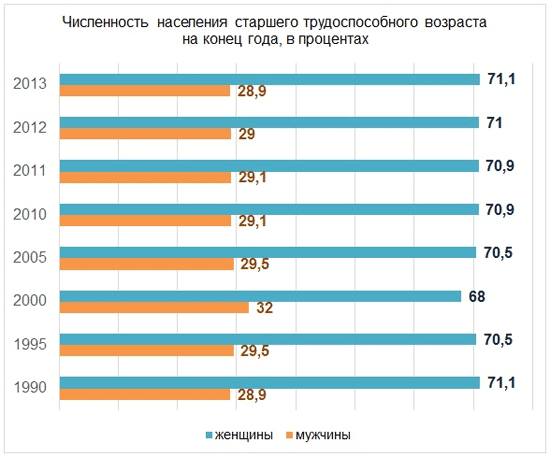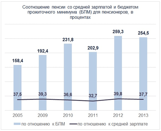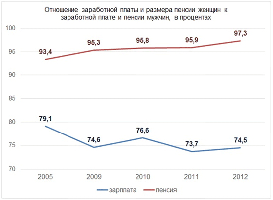 Кроме того, следует подчеркнуть: хотя размер пенсии по отношению к бюджету прожиточного минимума в последние годы увеличивается и для пенсионеров и пенсионерок в 2013 году составил 254,5%, по отношению к средней заработной плате он практически не меняется и составляет всего 37,7% [8]. Это означает, что уровень жизни пожилых женщин, которые составляют большинство среди других возрастных групп населения, определяется минимальными социальными гарантиями, которые редко пересматриваются и практически не меняются на протяжении последних лет.