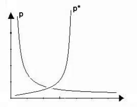 График 2.1. Ось Х показывается выгоды от использования услуг конкретного поставщика (p – действующая власть, p* – альтернативный кандидат). Ось Y показывает сравнительный уровень качества услуг конкретного поставщика.