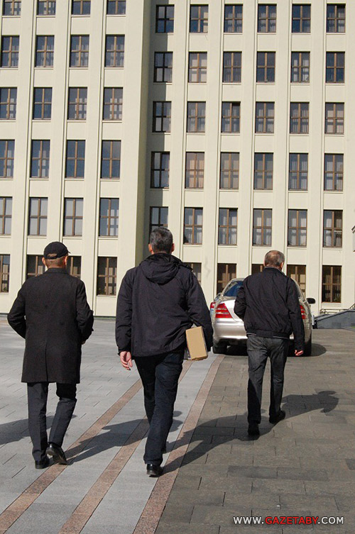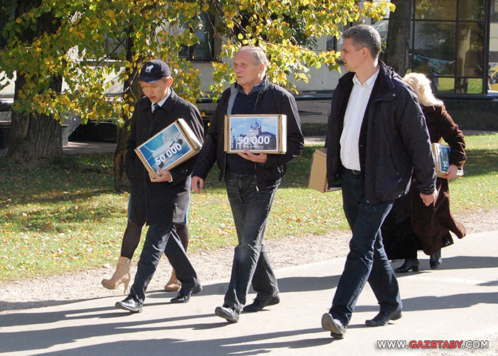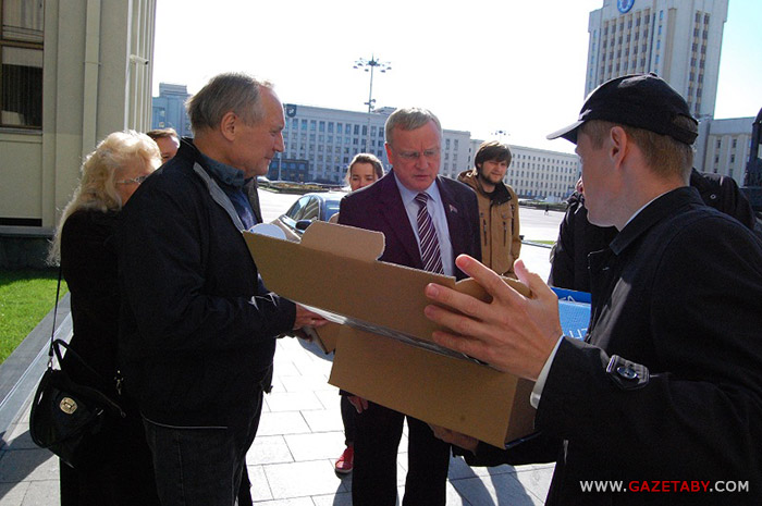 Наконец, после нескольких звонков на проходную спустился заведующий отдела по работе с обращениями граждан и юридических лиц Виктор Сазон, который и принял 50 тысяч подписей.