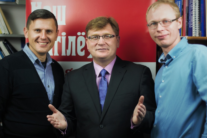 На фота (злева-направа: журналіст Алесь Буракоў, каардынатар кампаніі "Права выбару-2015" Алесь Сілкоў і журналіст Ігар Барысаў)