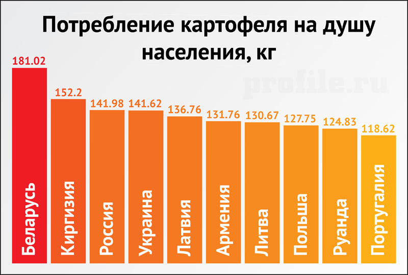 По данным Научно-практического центра Академии наук Беларуси по картофелеводству и плодоовощеводству, Беларусь на восьмом месте в мире по производству картофеля: она выращивает его чуть менее 10 млн тонн в год. Если пересчитать производство на душу населения (а Беларусь обгоняют такие гиганты, как Китай, Россия, Индия), то получится, что равных ей действительно нет — по крайней мере среди ведущих производителей.