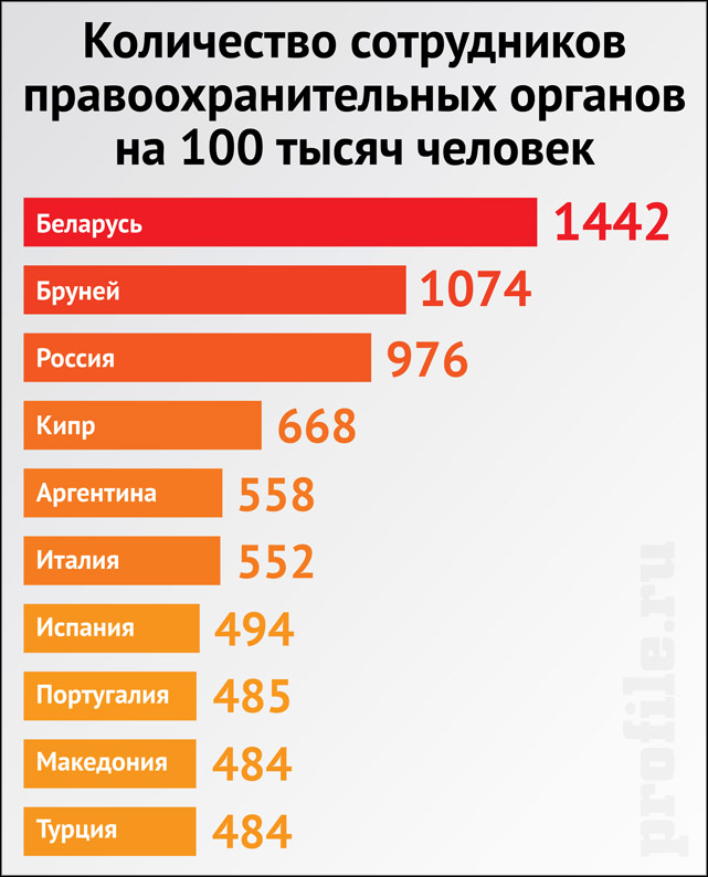 Согласно данным ООН, Беларусь не просто полицейская страна, а самая полицейская страна в мире. По состоянию на 2011 год рейтинг количества сотрудников правоохранительных органов на 100 тысяч человек выглядит следующим образом: