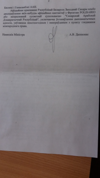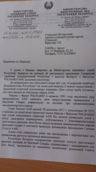 «Официальное признание Республикой Беларусь Западной Сахары или осуществления каких-либо официальных контактов с Фронтом POLISARIO или непризнанной мировым сообществом «Сахарской Арабской Демократической Республикой», включая установление дипломатических отношений, представляется нецелесообразным и неоправданным с точки зрения международного права», говорится в ответе за подписью заместителя министра иностранных дел А.Дапкюнаса.БСДП обратилась к министру иностранных дел Владимиру Макею с просьбой признать Сахарскую Арабскую Демократическую Республику, или Западную Сахару. Бывшая испанская колония Западная Сахара получила право на самоопределение в соответствии с декларацией Генассамблеи ООН, такое право признал и Международный суд в Гааге. Однако правительства Испании, Марокко и Мавритании, согласно Мадридскому пакту от 14 ноября 1975 года, отдали территорию Западной Сахары под контроль Марокко и Мавритании.В ответ Народный фронт POLISARIO активизировал вооруженную борьбу, в результате чего 27 февраля 1976 года была провозглашена Сахарская Арабская Демократическая Республика (САДР). Независимость САДР признали 60 стран-членов ООН.- Наша партия входит в «Прогрессивный альянс» - зонтичная организация, которая объединяет порядка 140 социал-демократических партий мира, в том числе туда входит Народный фронт POLISARIO. Мы постоянно встречаемся с ними на международных мероприятиях, знаем проблемы Западной Сахары и проявляем солидарные действия. Народный фронт POLISARIO обращался к правительству Беларуси с просьбой признать страну – никакого ответа не получил. Поэтому мы и решили обратиться в МИД Беларуси с аналогичной просьбой; в 2015 году мы не получили никакого ответа, а вот второй раз я отправил обращение заказным письмом. Буквально через пару месяцев получили ответ, что МИД не видит смысла в признании Западной Сахары, несмотря на то, что она признана более чем 60 странами, - поясняет инициативу партии ее председатель Игорь Борисов.28 апреля 2018 года Совбез ООН призвал Марокко и Народный фронт POLISARIO возобновить переговоры под эгидой Генсека ООН безо всяких предварительных условий. Однако референдум по самоопределению Западной Сахары постоянно откладывается.- Часть территории Западной Сахары контролирует Народный фронт POLISARIO, однако большая часть страны находится под марокканской оккупацией. Несмотря на резолюцию Генассамблеи о проведении референдума по самоопределению, Марокко проводит ползучую экспансию, земли заселяются марокканцами, - в общем марокканцы делают все возможное, чтобы затянуть проведение плебисцита в надежде, что в скором времени марокканцы просто станут доминировать в регионе. Поэтому мы и решили проявить солидарность с людьми, который борется за свою независимость. Это было актуальным для нас не только 100 лет назад – даже 27 лет назад, - пояснил Игорь Борисов.