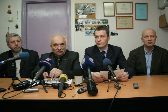Пресс-конференция в связи с арестом лидера афганского движения Николая Автуховича. На фото (слева направо): Александр Милинкевич, лидер объединения инвалидов войны в Афганистане Александр Комаровский, правозащитник Олег Волчек и Александр Козулин. 2009-й год