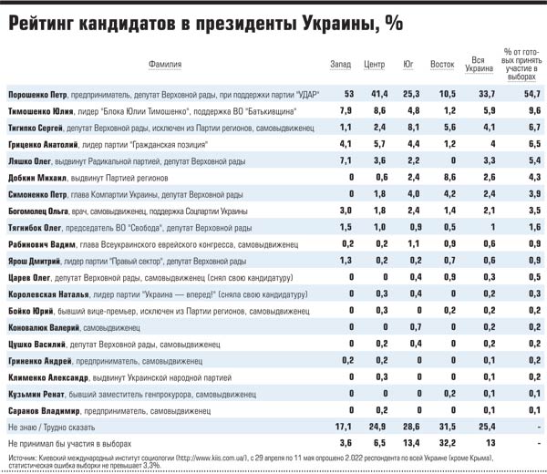 Самый высокий рейтинг сегодня - у Петра Порошенко. По данным Киевского международного института социологии он имеет шансы победить в первом туре, набрав 54,7% голосов (см. таблицу).