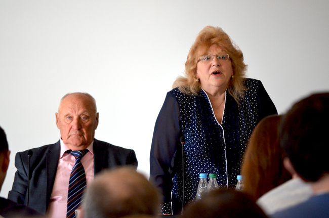 Тут вышла к трибуне активистка из Витебской области Антонина Пиванос. "Вы даете слово гостям, но так и не дали слово членам партии из Витебской области", - сказала она по-украински. Однако ничего не добилась: под всеобщий гул ей пришлось вернуться на место.