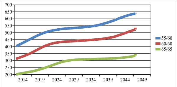 Динамика демографической нагрузки без изменения пенсионного возраста и с учетом его роста за период 2014-2051 гг.