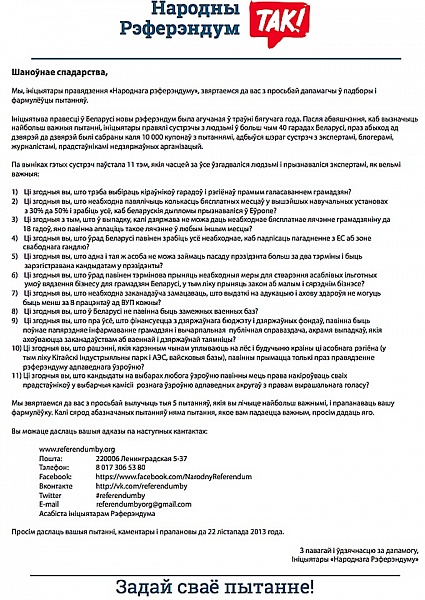 1) Ці згодныя вы, што трэба выбіраць кіраўнікоў гарадоў і рэгіёнаў прамым галасаваннем грамадзян?4) Ці згодныя вы, што ўрад Беларусі павінен зрабіць усё неабходнае, каб падпісаць пагадненне з ЕС аб зонесвабоднага гандлю?7) Ці згодныя вы, што неабходна заканадаўча замацаваць, што выдаткі на адукацыю і ахову здароўя не могуць быць менш за 8 працэнтаў ад ВУП кожны?10) Ці згодныя вы, што рашэнні, якія карэнным чынам уплываюць на лёс і будучыню краіны ці асобнага рэгіёна (у тым ліку Кітайскі Індустрыяльны парк і АЭС, вайсковыя базы), павінны прымацца толькі праз правядзенне рэферэндуму адпаведнага ўзроўню?Вы можаце даслаць вашыя адказы па наступных кантактах:Тэлефон: 8 017 306 53 80E-mail Асабіста ініцыятарам Рэферэндума