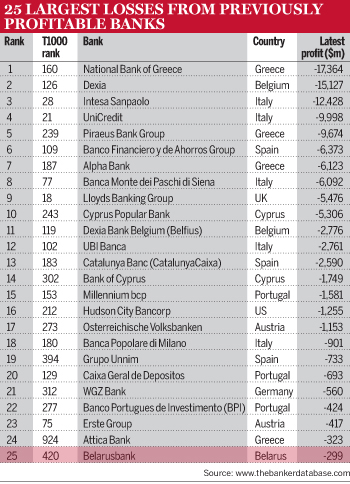 Однако в пресс-релизе издания есть еще один рейтинг, о котором государственные СМИ не сообщат - топ-25 ранее прибыльных банков, понесших в 2011 году наибольшие убытки (25 largest losses from previously profitable banks).