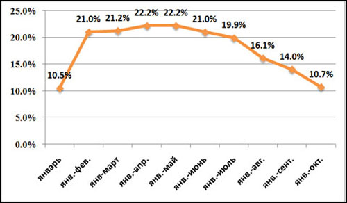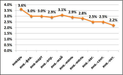 За январь-октябрь 2012 года темп роста ВВП в Беларуси составил всего лишь 2,2%. С учетом этого достичь запланированных 5-5,5% к концу года уже практически нереально. Хотя в первом квартале экономический рост составлял 3%, и казалось, что пятипроцентный барьер, предусмотренный официальным макропрогнозом, к концу года мы преодолеем без проблем.