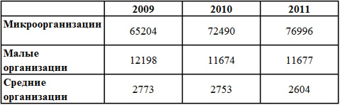 Как видим, количество микроорганизаций (с численностью до 15 человек) за последние годы увеличилось. В то же время количество малых организаций (с численностью от 16 до 100 человек) в 2011-м практически не изменилась, а вот количество средних организаций (с численностью от 101 до 250 человек) ежегодно снижается.