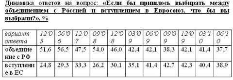 По словам экспертов НИСЭПИ, «параллельное снижение готовности как к евроинтеграции, так и к интеграции с Россией подтверждают и ответы на вопрос, моделирующий ситуацию дихотомического выбора — Россия или Евросоюз».