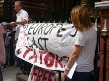 Акция прошла у белорусского посольства на улице Кенсингтон Корт 6 в Лондоне в четверг 1 июля. Возглавили акцию протеста всемирно известный драматург и режиссер сэр Том Стоппард и актер и режиссер Сэмюэль Уэст.