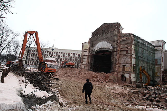 «Гэтыя сцены было неабходна дэмантаваць, — кажа архітэктар праекта Раіса Рымашэўская. — Інакш пры працах мог абрынуцца будынак. Ніякай нашай самадзейнасці тут няма — кожнае рашэнне па зносе той ці іншай часткі будынку мы прымаем калегіяльна. То бок, у выпадку гэтай часткі будынка ўзнікла вельмі сур’ёзная сітуацыя, не вырашыўшы якую, мы маглі б паставіць пад пагрозу ўвесь праект. Гістарычны пласт будынка мы максімальна захоўваем, разбураныя сцены адносіліся да 50-х гадоў XX стагоддзя.