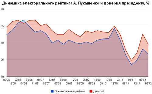 Нижеследующий график построен по данным долгосрочных исследований НИСЭПИ электорального рейтинга А. Лукашенко и доверия институту президента и представляет долю утвердительных ответов на закрытые вопросы «Если бы завтра состоялись выборы, то за кого бы Вы проголосовали?» (электоральный рейтинг) и «Доверяете ли Вы следующим государственным и общественным институтам?» (доверие институту президента):