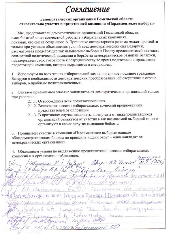 Гомельская оппозиция приняла соглашение по парламентским выборам