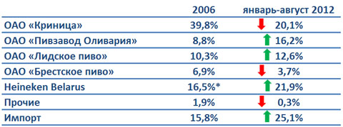 *Примечание: в 2006-м году на рынке работали компании «Сябар» и «Речицапиво», которые в 2007-2008 гг. были приобретены концерном Heineken