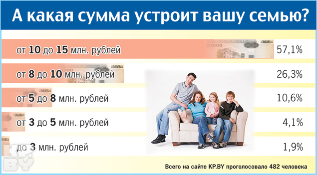 Российский исследовательский холдинг «Ромир» выяснил, что российской семье из трех человек для нормальной жизни нужно почти 2000 долларов в месяц. «Комсомольская правда в Беларуси» провела опрос на своем сайте: А какая сумма устроит вашу семью?