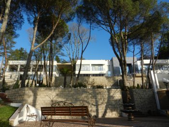 На одном конце пустынного пляжа — недостроенный ресторан, на другом — «гостевой домик», шикарный двухэтажный коттедж. А вот и резиденция. Перед зданием — площадь с фонтаном, зеленый газон, через который тянется вымощенная плиткой дорожка. Непосредственно к двухэтажному зданию резиденции ведет мраморная лестница. Таким же мрамором отделаны стены.