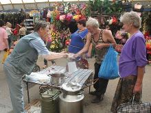 Николай Черноус, торгующий на рынке детскими игрушками, сам приготовил все блюда. «В первый раз всем желающим еды не хватило, – рассказал он. – Поэтому на второй раз я приготовил и первое, и второе, и третье – борщ, перловую кашу с мясом и компот. Готовил сам с самого утра на костре».