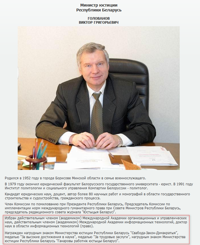 Контроль за выполнением данного указа был возложен на Совет Министров РБ в лице Министерства юстиции, которое в то время как раз и возглавлял Виктор Голованов. Дважды псевдоакадемик и единожды доктор мифических наук вот этих самых организаций, чья деятельность была признана вне закона.