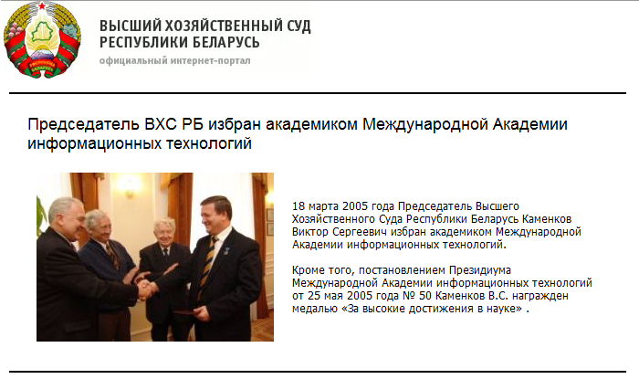 Новость о присвоении председателю ВХС «липового» ученого звания «академика» и награждении его ничего не значащей медалью ОО была опубликована на официальном сайте Высшего хозяйственного суда.