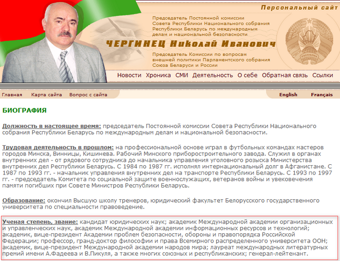 Только председатель ВХС Виктор Каменков в своих гордыне и тщеславии переплюнул «академика» Голованова и вышел на международный уровень. Его псевдозаслуги перед наукой указаны в биографии на официальном сайте Экономического суда Содружества независимых государств.