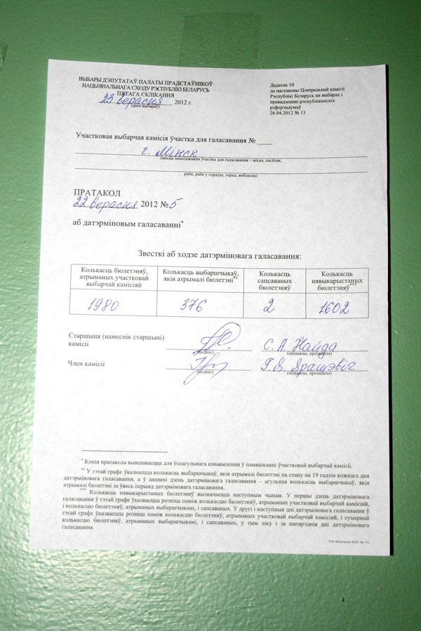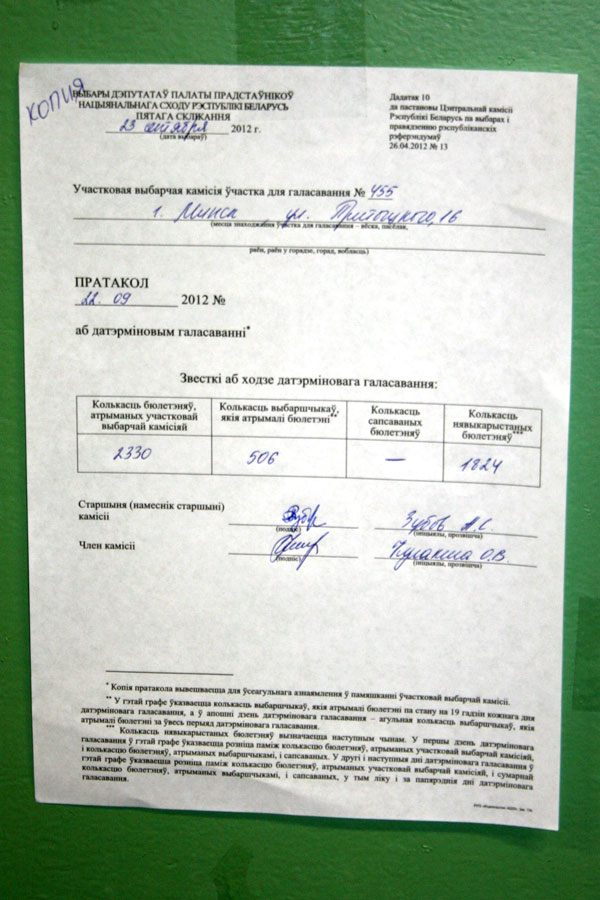Кальварийский округ №104 (22.09.2012). О том, как осуществляется подлог явки избирателей, свидетельствует наблюдатель от ОГП. Наиболее показательным является расхождение данных наблюдения и цифр, представленных комиссией в протоколе на участке №455. По данным наблюдателя на конец досрочного голосования здесь проголосовало 3,96% избирателей, а комиссия дала в протоколе почти 23%. Фальсификации составили 19%.
