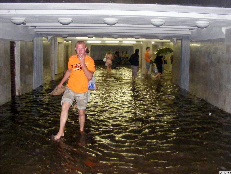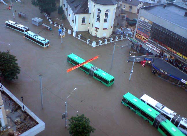 - Начало дождя не предвещало ничего необычного: с неба падали тяжелые, но редкие капли, казалось, что минут через пятнадцать все закончится, и спастись можно простым зонтиком. Но потом небо стемнело, раскололось внушительными молниями, и ливень пошел с такой силой, словно кто-то открыл кран. За полчаса отрезок Немиги от Дома мод до лестницы в торговый дом на Немиге превратился во внушительное озерцо, в котором плавали маршрутки, троллейбусы и легковые автомобили. Воды было по колено, а в отдельных местах и по пояс.
