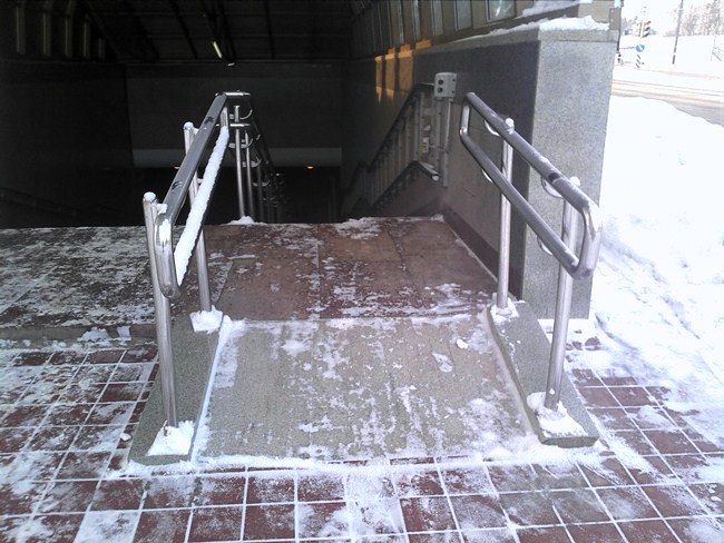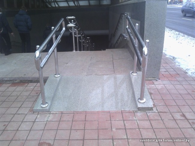 - Так случилось, что я живу неподалеку и каждый день хожу через подземный переход на пересечении улицы Хмелевского и проспекта имени Феликса Эдмундовича. Метро там нету, и поэтому ТНП во время своей ревизии туда не заехал. В противном случае он обязательно разбил бы себе голову или хотя бы отбил задницу. Дело все в том, что строители сейчас очень заботятся об инвалидах, и все новые подземные переходы оборудованы подъемниками (которые в скором будущем, будем надеяться, заработают), а наклонные пандусы при выходе на улицу, на конкретно указанном переходе сделаны таким образом, что любой здоровый человек может стать инвалидом. Они из плитки, которая никак не предназначена для напольных покрытий - она слишком скользкая, а при попадании на нее воды или снега коэффициент сцепления с ботинками и вовсе стремился к нулю.