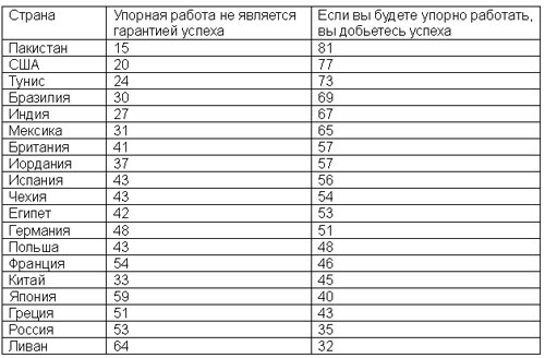 В июле 2012 года Pew Research Center опубликовал данные опроса жителей 21 развитых и развивающихся стран. Ученые спрашивали об оценке перспектив экономики, отношению к свободному рынку и к труду, как источнику материального благополучия. В 13 из 21 стран преобладает мнение, что упорный труд является источником успеха. Такой точке зрения придерживаются 81% пакистанцев, 77% американцев, 69% бразильцев, 67% индийцев, 57% британцев и 56% испанцев. Германия, по сути дела, разделена на две половины по данному вопросу. 48% немцев считают, что упорный труд не является гарантией успеха, а 51% поддерживают тезис о том, что упорная работа приводит к материальному успеху. В труд, как источник материального успеха, верят только 46% французов (развращение государственными программами), 48% поляков (укоренившаяся культура распределения), 40% японцев, 43% итальянцев (огромная система перераспределения национального богатсвта) и только 35% россиян. При этом 53% россиян считают, что упорная работа не является гарантией успеха. Беларусь и Украина не попали в опрос, но близость общественных и государственных институтов позволяет предположить, что в Беларуси с ее архаичной, еще советской структурной собственности едва ли более трети граждан укажут на труд, как на основной источник материального успеха. Большинство будет указывать на состоятельных родителей и родственников, связи и знакомства, удачу и даже божественное благословение.