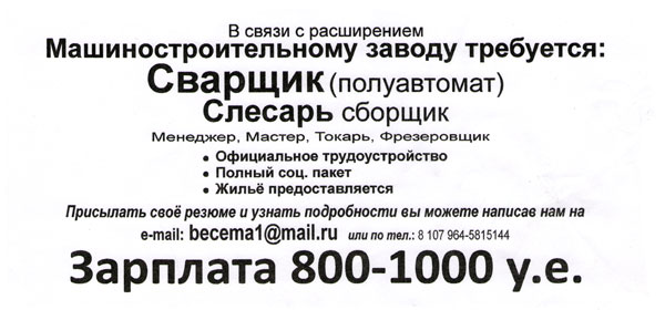 Итак, ОАО «Бецема» из города Красногорска, производящее дорожно-строительную и автоспецтехнику, ищет в Борисове сварщиков на полуавтоматы, слесарей-сборщиков, менеджеров, мастеров, токарей фрезеровщиков, обещая при этом официальное трудоустройство, обеспечение жильем, полный социальный пакет и заработную плату от 800 до 1000 долларов.