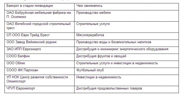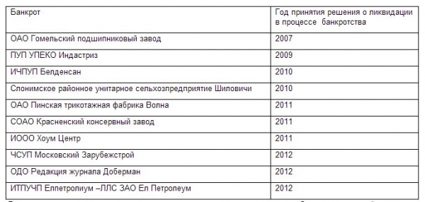 В еще один рейтинг мы внесли предприятия, решения о ликвидации которых были приняты хозяйственными судами Беларуси в прошлом году, но сама ликвидация еще не произошла. В нем также достаточно много известных брендов.