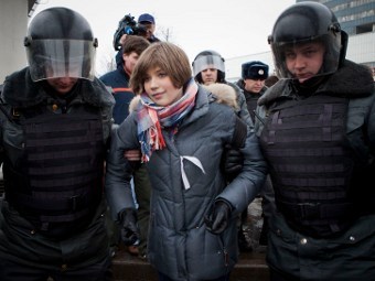 Примерно в середине акции ОМОН произвел серию достаточно жестких задержаний, в результате которых пострадали и журналисты - в частности, сотруднику "Коммерсанта" разбили очки. Задерживали в основном людей с плакатами и тех, кто скандировал лозунги. Среди задержанных были и несколько провокаторов от прокремлевских движений - они поднимали плакаты, провоцируя полицейских задерживать вместе с ними и стоящих рядом.