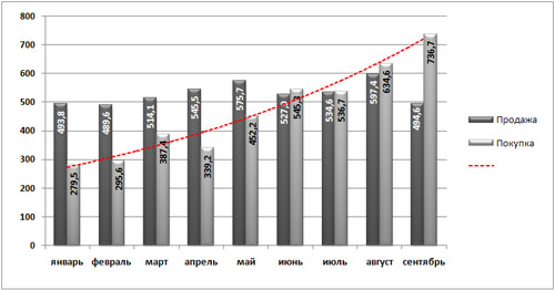 Как видим, в сентябре население купило валюты на 736,7 млн. долларов, а продало только 494,6. По сравнению с августом предложение валюты со стороны населения сократилось на наличном рынке на 102,8 млн. долларов. В то же время объем покупки иностранной валюты в сентябре вырос на 102,1 млн. долларов. В результате, в первом осеннем месяце покупка наличной валюты превысила ее продажу на 242,1 млн. долларов. По сравнению с предыдущими месяцами это самый высокий объем чистой покупки иностранной валюты населением.
