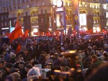 Толпа скандировала лозунги: "Ленин, партия, комсомол", "Вся власть советам", "Революция", нацболы шли с отдельным баннером "Пусть будет бунт", а Левый фронт скандировал: "Путин в Кремле, Россия в беде".