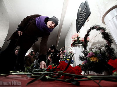 Как сообщает «Наша Ніва», уже около 16.45 возле мемориальной дощечки собрались журналисты и несколько людей, которые возложили цветы и зажгли свечи.