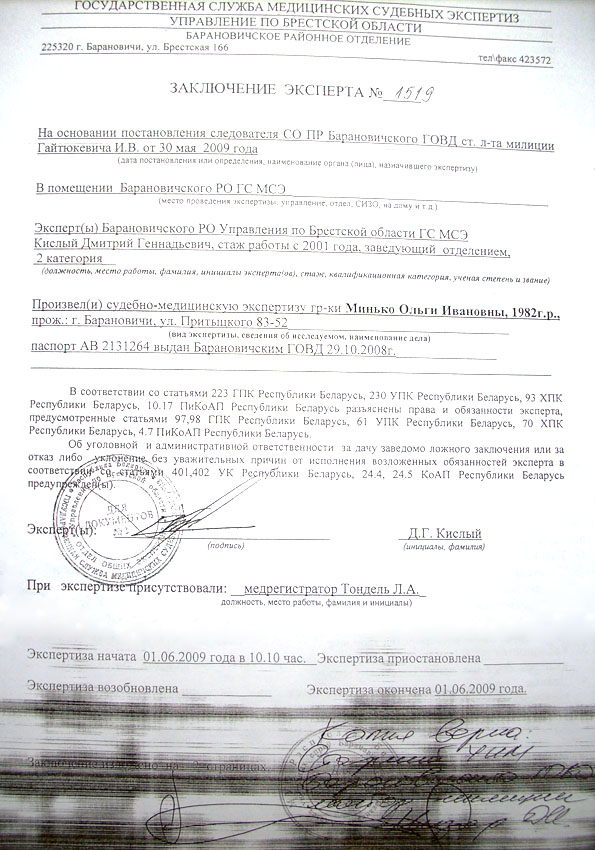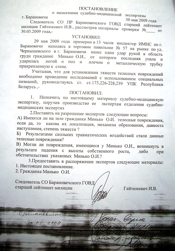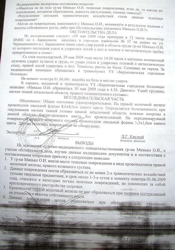 29 мая 2009 года на Барановичском коопрынке была избита работником ИМНСпо г. Барановичи ст. инспектором Чернявским Валерием Эдуардовичем наша коллега Минько Ольга Ивановна.