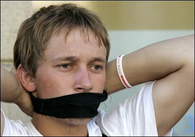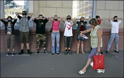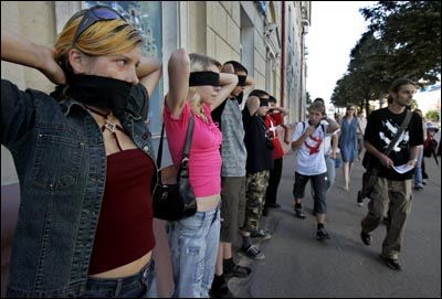Ребята стояли с черными лентами, которые повязали на глаза или рты. Молодые люди раздавали также листовки с фотографией Дениса Денисова и фактами, касающимися его преследования, избиения и похищения.