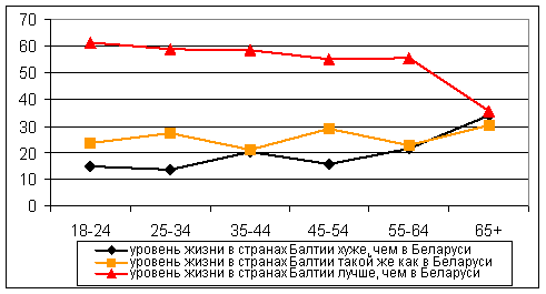 Неудивительно, что большинство населения поддерживает действующую экономическую политику и достаточно оптимистично смотрит на ближайшую перспективу. В то же время, согласно опросу Исследовательского центра ИПМ, несмотря на признание того факта, что в странах с рыночной экономикой и небольшим госвмешательством уровень жизни выше, чем в странах со значительным госвмешательством, население скептически оценивает уровень жизни не только в России или Украине, но и странах Балтии. Так, только 47% людей считают, что в странах Балтии люди живут лучше, чем в Беларуси (при 14% тех, кто затруднился ответить). Принимая во внимание разницу в возрасте при ответах респондентов, все-таки нужно отдать должное пропаганде (рис. 1, таблица 1).